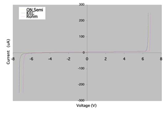 为了进行公平比较,所选部件应具有相似的封装尺寸和数据表规格。本次比较选择的部件是三个 ESD ?;ざ?,在比较数据表中的电气特性时,这三个二极管被视为可以直接替代。这些器件均为双向 ESD ?;ざ?,具有相同的击穿电压 (6.8V)、电容 (15pf) 和封装外形 (1.0 mm x 0.6 mm x 0.4 mm)。本研究选择的产品是 Rohm 的 RSB6.8CS、KEC 的 PG05DBTFC 以及 ON Semiconductor 的 ESD9B5.0ST5G。