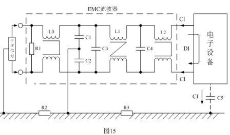 图15与图14相比,多了一个L0低通电感滤波器,目的是为了提高对外来传导干扰信号的抑制能力。如果只考虑提高抑制本电子设备干扰的能力,可把C1、C2的连接位置移放到电源线的最前端,即:尽量靠近测试仪表的接入处,抑制干扰效果会更显著。需要检查电子设备对外来电磁干扰信号的抑制能力,可在电源线输入端输入一个干扰信号,然后检测电子设备被干扰影响的程度,如:电视机出现行扫描不同步等。对不同的电子设备,干扰信号也有不同的要求,这些标准制定一般都是由行业协会提出,最后由标准制定单位推荐使用。