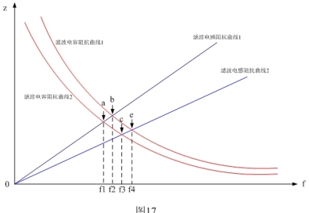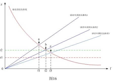 图16表示C5电容与L0、L1、L2等电感滤波器的频率-阻抗特性图。图16中红线表示设备对地电容C5的频率阻抗曲线;蓝线是滤波电感L0、L1、L2的频率阻抗曲线。