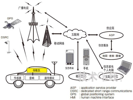 首先介绍车载导航仪的多功能化和高速化。众所周知,车载导航仪的出发点是导航,然后才是通过DSRC(Dedicated Short Range Communications )、电视、移动网络等通信手段与车外相连接。现在,车载导航仪已不再是单纯的指路工具,而是发展成为了能够借助各类供应商进行多种内容交换的双向交流装置。为了向驾驶员提供安全、放心、便利、舒适的驾驶环境,车载导航仪正在向联结人与机械(这里指汽车)的HMI(Human Machine Interface)中心转变(图1)。