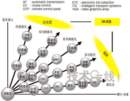 图2:车载导航仪的多媒体化在兼顾“贴心服务”和“愉悦心情”的同时增加功能。EMC成为重要课题。
