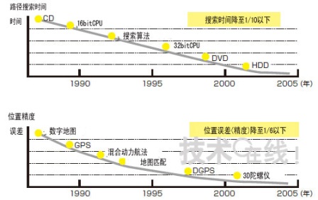 图3:性能的变化图在从导航仪向语音导航仪、多媒体型导航仪转变的过程中实现了大幅度的高速化·高精度化。
