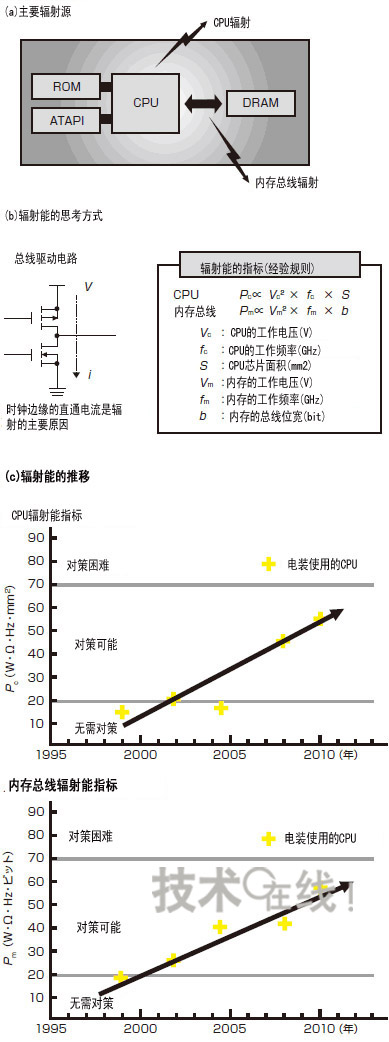 芯片面积和时钟频率的增加容易导致辐射电磁噪声增大。因此,对这些辐射源的辐射进行预测管理会逐渐成为重要环节。对于车载导航仪的核心(Navi-Core),如图5(a)所示,CPU和总线是主要辐射源。由经验可知,直接来自于CPU的辐射能指标Pc与工作电压的平方、工作频率、芯片面积分别成正比,这些数值的积被作为“辐射能指标”应用到了预测管理(图5(b)注1)之中。内存总线的辐射能指标Pm也同样与工作电压的平方、工作频率、内存总线位宽的积成正比。[page]