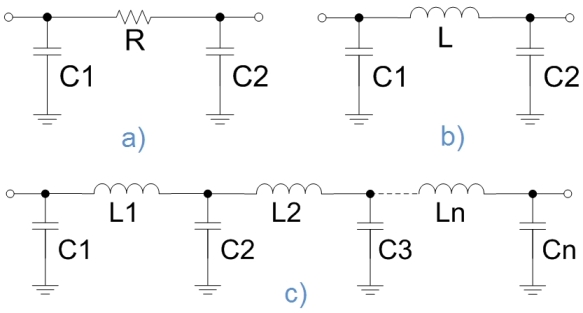 图1:常见EMI/RFI滤波器类型的结构示意图:a)π型RC;b)π型LC;c)LC梯形。