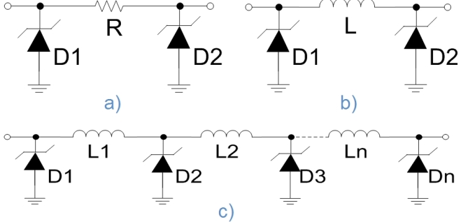图2:集成型EMI滤波+ESD保护方案:a)π型RC;b)π型LC;c)LC梯形