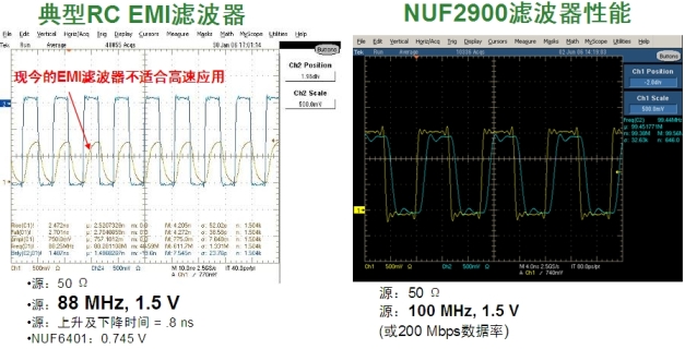 图4:典型RCEMI滤波器与高速LCEMI滤波器(NUF2900)的响应性能比较。