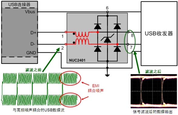 图5:带超低电容ESD保护的集成CMC滤波器NUF2401MN用于USB2.0等高速应用。