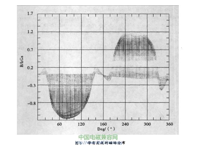 则会严重影响EMi,且不易被发现。以图5为例.两磁极在靠近中性线的位置处均有与该磁极极性相反的一段反波.仔细分析借偏的原理可知,该反波事实上相当于一个与正?;幌蚣饔孟喾吹母郊哟偶?,当其被转子换向线圈切割时,产生的电动势与电抗电动势同向,也就是会恶化换向;当其分布角度超过借偏角度时,会完全抹杀借偏的作用。