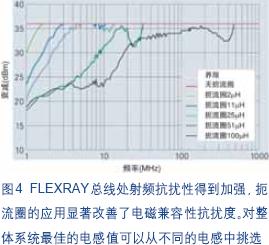 物理层应用指南明确指出了对FlexRay网络数据线扼流圈的总体要求,比如引线电阻(<1W)、电感(>50mH)以及杂散电感(<1mH)。对电磁辐射和电磁干扰的测定与CAN总线一样。不过,由于10Mbit/s的更高传输率,需要更加仔细地检查信号完整性。图4所示为对具有各种电感的扼流圈与不使用扼流圈的测试板进行DPI测定的相应评估结果。图五所示为使用另一块测试板进行电磁干扰测量的结果,同样是针对具有不同电感的扼流圈。很明显可以发现,数据线扼流圈的使用改善了电磁兼容性并减少了干扰辐射。当电感更高时,作用就更大。不过,更高的电感值会对信号完整性产生一定的负面影响。[page]