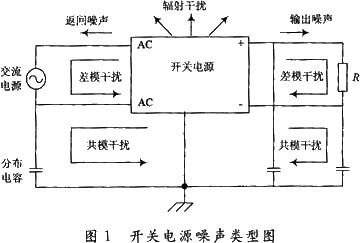 如图1所示,电网中含有的共模和差模噪声对开关电源产生干扰,开关电源在受到电磁干扰的同时也对电网其他设备以及负载产生电磁干扰,例如返回噪声、输出噪声和辐射干扰等。进行开关电源EMI/EMC设计时,一方面要防止开关电源对电网和附近的电子设备产生干扰;另一方面要加强开关电源本身对电磁干扰环境的适应能力。下面用等效电路分别介绍共模和差模干扰产生的原因及路径。