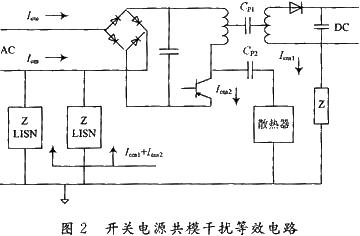如图2所示,当开关管转为“关”时,集电极与发射极间的电压快速上升达500V,他产生的电流经集电极与地之间的分布电容返回整流桥,这个按开关频率工作的脉冲串电流是共模噪声。这个电压会引起共模电流Icm2向CP2充电和共模电流Icm1向CP1充电,其中CP1为变压器初、次级之间的分布电容,CP2为开关电源与散热器之间的分布电容(即开关管集电极与地之间的分布电容)。则线路中共模电流总大小为Icm1+Icm2。