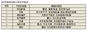 造成电源干扰复杂性的第二个原因是干扰表现的形式很多,从持续期很短的尖峰干扰直至电网完全失电,其中也包括了电压的变化(如电压跌落、浪涌和中断)、频率变化、波形失真(包括电压和电流的)、持续噪声或杂波,以及瞬变等。我们根据国内外的抗扰度测试的一系列标准和实际应用中常常出现的问题,总结了电源干扰的常见起因,如表1所示。