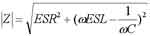 随着电路系统时钟频率的增加,很多情况就不能按照理想的电容器来考虑了。一个实际的电容不论是陶瓷电容还是电解电容,都可以被简化成一个串联RLC的模型。一个电容模型包括自身的电容C,还包括了等效的串联电感ESL和等效串联电阻ESR这两个重要的参数。这个串联模型的阻抗幅值是: