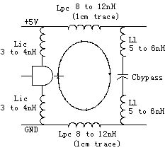 图5为电流环的模型。从电流环模型中我们可以看出,环路中存在寄生电感,它们在高频状态下表现为环路的阻抗可导致供给电源产生尖峰,并会辐射电磁波从而干扰系统的其他部分?;仿分蠰l为电容管脚引线的封装电感;Lpc为电容管脚到器件电源或者地管脚之间的PCB传输线的寄生电感;Lic为器件管脚引线的寄生电感。另外,在前面我们讨论过电容本身也是具有寄生电感ESL的。这样回路的总电感为:L=2Ll+2Lpc+2Lic+ESL。由于环路的寄生电感将会给整个系统带来电磁干扰,产生电压尖峰,这个电压尖峰值同串联电感之间存在一定的关系,近似计算公式如下: