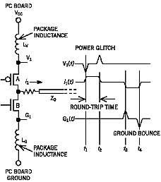 图6为一个简单的图腾柱I/O口电路,驱动一个串联源端匹配的传输线。图中LV和LG为器件电源管脚和地管脚的封装电感,A、B为两个场效应管,作为开关使用。假设初始时刻传输线上各点的电压和电流均为零,在某一时刻器件将驱动传输线为高电平,这时候器件就需要从电源管脚吸收电流。在时间t1,合上开关A,电流从PCB板上的VCC流入,流经封装电感LV,跨越开关A,串联终端电阻,然后流入传输线,输出电流幅度为(1/2)VCC/Z0。电流在传输线网络上持续一个完整的轮回(round-trip)时间,在时间t2结束。至此以后,整个传输线处于电荷充满状态,不需要额外流入电流来维持。当电流瞬间涌过封装电感LV时,将在结点V1处导致芯片电压的扰动。在时间t3,关闭开关A,这一动作不会导致脉冲噪声的产生,因为在开关A打开的瞬间是没有电流流过的。同时,合上开关B,这时传输线、地平面、封装电感LG以及开关B形成一环路,有瞬间电流流过开关B,这样在结点G1处产生地弹扰动。如果在V1和G1之间加上一旁路电容(放置在芯片内部)的话,可以使得V1点处和G1点处的瞬态电压扰动相同,这样在每一次开关切换时,V1点和G1点均会产生电压扰动,然而幅度将会减半。
