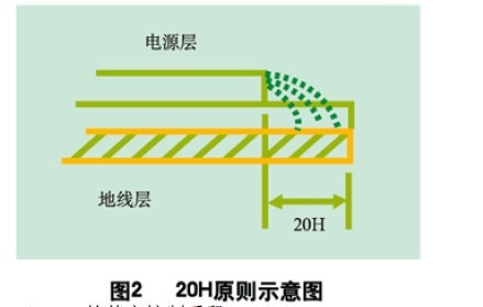 为了减小电源的边缘辐射,电源/地平面应遵循20H设计原则,即地平面尺寸比电源平面尺寸大20H(见图2),这样边缘场辐射强度可下降70% 。