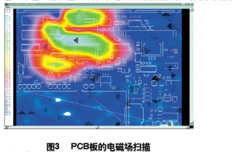 利用电磁辐射扫描仪,对装联并上电后的机盘扫描,得到PCB中电磁场分布图(如图3,图中红色、绿色、青白色区域表示电磁辐射能量由低到高),根据测试结果改进PCB设计。
