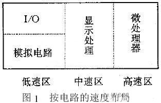 单元电路工作频率越高,速度就越快,信号的频谱也就越丰富;高频分量比例越大,对外干扰也就越强。可根据单元电路的工作频率分为高速电路(如微处理器),中速电路(如显示处理),低速电路(如接口)和模拟电路(如模拟信号放大器)。多种速度电路在印制板上的布局一般如图1所示。