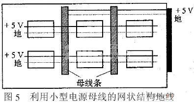 对于同类单元电路(或元器件)提高电磁兼容性效果的有效方法是采用网状结构地线如图4所示。图中实线为正面轨线,虚线为反面轨线,实线与虚线相互垂直,交叉点处由金属化孔连接。这样电流可以就近回流。图4中的垂直地线可能给正面布线造成一定困难,可用小型母线来替代,并与电源供电线连结起来如图5所示。图中垂直的宽线条代表小型电流母线,可以装卸,便于调度。