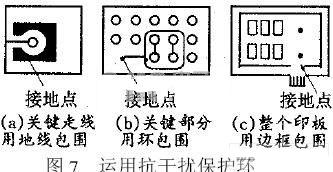 4.2在敏感元器件接线端头和印制板的边框用地、环保护起来,如图7所示。注意?;せ凡荒艹涞钡缌骰叵撸荒艿サ憬拥?。
