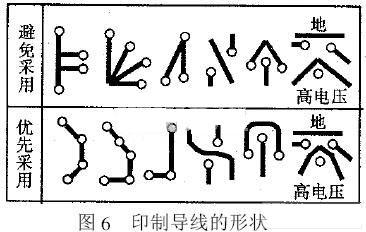 4.1 走线形状不要有缠结和分支或硬拐角。因为那样可能会破坏导线特性阻抗的一致性或导致反射和产生谐波或局部高电压引起放电现象。一般优先选用和避免采用的印制导线形状,如图6所示。