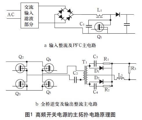 在图1a电路中的整流器、功率管Q1,在图1b电路中的功率管Q2~Q5、高频变压器T1、输出整流二极管D1~D2都是高频开关电源工作时产生电磁骚扰的主要骚扰源,具体分析如下。