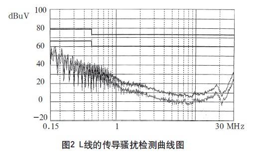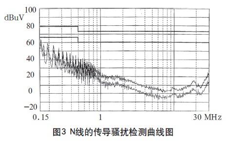 在3m法电波暗室对试验样机进行测试,其L、N线的传导骚扰检测曲线如图2、3所示,辐射骚扰的垂直极化扫描曲线如图4、5所示。