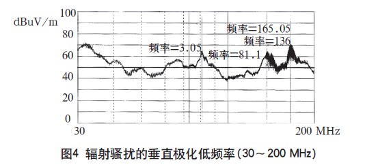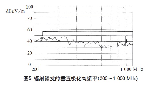 本开关电源一次通过了传导骚扰的测试,测试波形如图2、3所示。辐射骚扰高频段230~1000MHz也测试合格,如图5所示。只是在30~200MHz频段范围内的垂直极化指标超标,最大超标20dB,如图4所示。