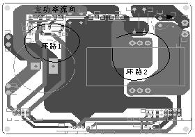 对于元器件的放置,由于开关电源的辐射干扰(E)与电流通路中电流(I)的大小,通路的环路面积(A),以及电流频率(f)的平方等三者的乘积成正比,即E=I·A·f2。运用这一关系的前提是通路尺寸远小于频率的波长(此电路符合条件)。