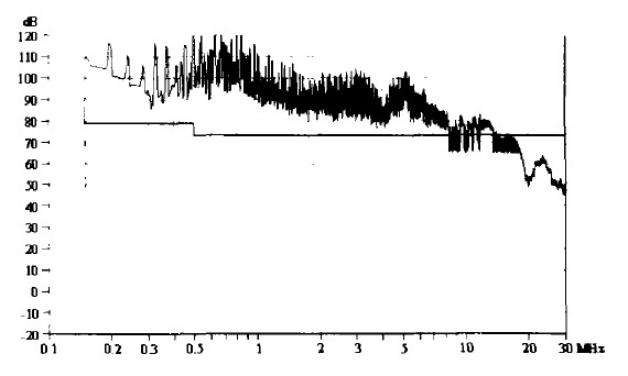 由图5可以看出,传导骚扰值在某些频段处还有超差,效果不十分理想,这是因为,传导接受机所测得的传导骚扰值是个综合参数,它无法判断出在0.15—15MHz频率范围内,共模干扰和差模干扰孰重孰轻,一般讲:在0.15~0.5MHz低端差模干扰分量很大,在0.5~5MHz共模干扰和差模干扰同时存在,在5~30MHz之间共模分量较大。原因之二是由于滤波器的电感和电容元件都受其分布参数的影响,频率愈高所受的影响愈大。滤波器内部电感、电容的装配工艺、接地质量也会对插入损耗产生很大的影响。原因之三是,由于滤波器电感会受到电流浪涌的影响,它工作的峰值电流比额定电流要大一倍左右,在重载和满载时,差模电感容易产生磁饱和现象,致使电感量迅速下降,导致插入损耗性能变坏。