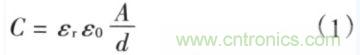 式(1)显示,减小电容器极板之间的距离(d)和增加极板的截面积(A)将增加电容器的电容量。电容通常存在等效串联电阻(ESR)和等效串联电感(ESL)二个寄生参数。