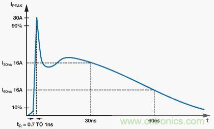 图1显示了规范所述的8 kV接触放电电流波形。一些关键波形参数包括小于1 ns的上升时间和大约60 ns的脉冲宽度。这说明脉冲总能量约为数十mJ。