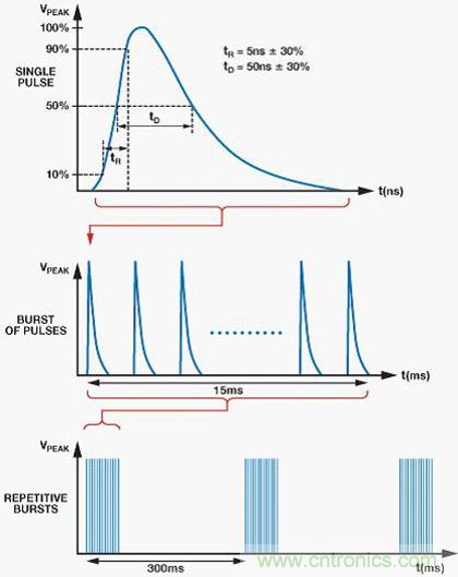 电快速瞬变测试要求将数个极端快速的瞬变脉冲耦合到信号线上,以代表容性耦合到通信端口的外部开关电路的瞬态干扰,这种干扰可能包括继电器和开关触点抖动,以及切换感性或容性负载引起的瞬变,所有这些在工业环境中非常常见。EC 61000-4-4中定义的EFT测试尝试模拟因为这些类型的事件产生的干扰。
