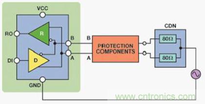 电阻将电涌瞬变耦合到通信线路。图4显示半双工RS-485器件的耦合网络。并联电阻总和为40 Ω。对于半双工器件,每个电阻为80 Ω。