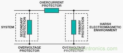 图5显示一个典型?;し桨福涮卣魇蔷哂辛街乇;ぃ褐鞅;ず痛渭侗;?。主保护可将大部分瞬变能量从系统转移开,通常位于系统和环境之间的接口。它旨在将瞬变分流至地,从而消除大部分能量。