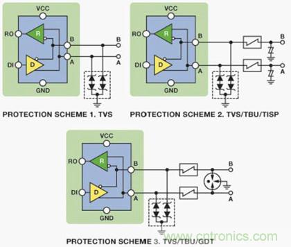 图6所示电路显示了三种不同的完整的EMC兼容解决方案。每个解决方案都经过独立外部EMC兼容性测试公司的认证,各方案使用精选的Bourns外部电路保护元件,针对ADI公司具有增强ESD保护性能的ADM3485E 3.3 V RS-485收发器提供不同的成本/?;ぜ侗?。所用的Bourns外部电路?;ぴㄋ蔡缪挂种破?CDSOT23-SM712)、瞬态闭锁单元(TBU-CA065-200-WH)、晶闸管电涌?;て?TISP4240M3BJR-S)和气体放电管(2038-15-SM-RPLF)。