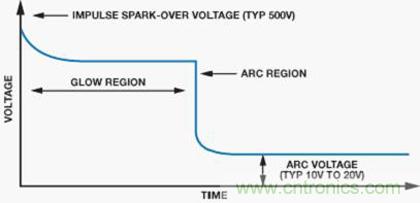 图9显示GDT的典型特性。当GDT两端的电压增大时,放电管中的气体由于产生的电荷开始电离。这称为辉光区。在此区域中,增加的电流将产生雪崩效应,将GDT转换为虚拟短路,允许电流通过器件。在短路事件中,器件两端产生的电压称为弧电压。辉光区和电弧区之间的转换时间主要取决于器件的物理特性。