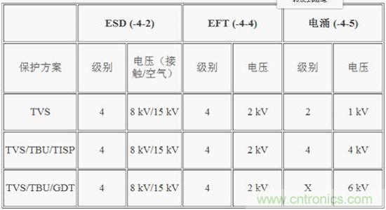 前面说过,EFT和ESD瞬变具有相似的能量水平,而电涌波形的能量水平则高出三到四个数量级。针对ESD和EFT的?;た赏ü嗨品绞绞迪郑攵愿叩缬考侗鸬谋;そ饩龇桨冈蚋丛?。第一个解决方案提供四级ESD和EFT?;ぜ岸兜缬勘;?。本文描述的所有电涌测试都使用1.2/50 μs波形。