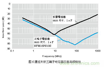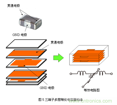 如图5所示,片状三端子电容器虽名为三端,但实为四端结构。这是因为,虽然四端设计可减少接地端电感,但电气特性方面,无论哪个端子都具备相同电位。而引线型三端子电容器原本就为三端结构,因此贴片化后仍被称为"三端"。[page]