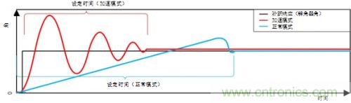 当旋转变压器的电机位置或输出信号变化迅速时,稳定时间是RDC控制系统的快速性能指标[2]。图1显示的一个是有阶跃输入变化(黑线)的RDC反馈控制系统的稳定时间的例子。蓝色信号显示的是对电路的正常模式响应,红色信号显示的是加速模式过程中响应(角快速变化)。为了在快速变化的条件下追踪到旋转角,加速模式帮助控制回路很容易跟踪到一个快速的旋转角[4]。