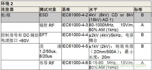 TI工程师测试IEC61800-3标准来获取环境规范(表1)。该设计使用铠装连接器和铠装电缆(长度>30m)。标准的定义见表2。