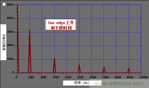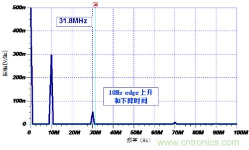 根据该公式,10nsEdge Rate对应的谐波频率大约为31.8MHz。图3显示:最后一个重要的谐波频率为30MHZ。同时,1ns的Edge Rate对应的谐波频率318MHZ(图2)。如果频率范围扩展到300MHZ以外,显示的谐波仍很明显,但却在相关频率上迅速变小。