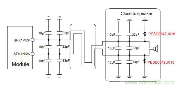 对于扬声器的静电保护,可以采用0402或0201的超低电容 ESD器件PESD0542U015,可以节约布板空间,且因为0.05PF的电容,可以保证此模拟信号的完整传输。