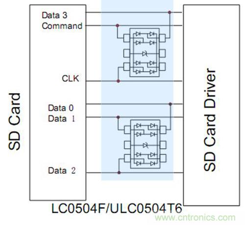 SD卡重点?;ata数据线和CLK,要确保选择的ESD器件是低容值和小封装的产品:LC0504F SOT-563