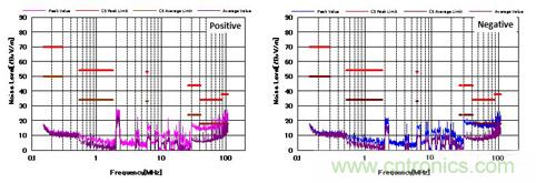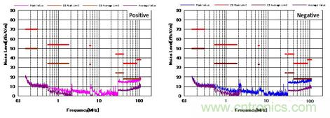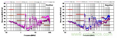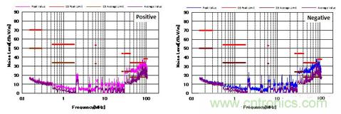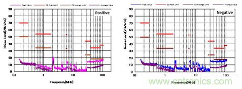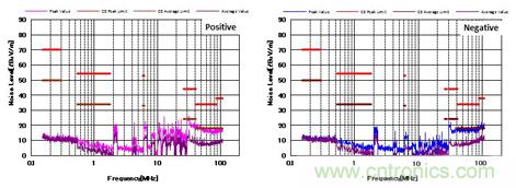 图4显示了增加CM和DM滤波器后的噪声特性。 与图3相比,CM滤波器的增加降低了近20dBμV/ m的CM噪声。 并且EMI性能也通过了CISPR25 C5标准。