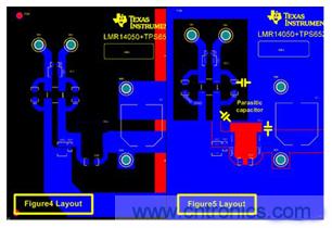 图4和图5之间噪声结果的不同主要是由于PCB布线差异所致,如图6所示。图5的布线中(图6的右侧),大面积覆铜(GND)包围着DM滤波器,并和Vin走线形成了一些寄生电容。 这些寄生电容为高频信号旁路滤波器提供了有效的低阻抗路径。 因此,为了最大限度地提高滤波器的性能,需要移除滤波器周围所有的覆铜,如图6左侧的布线。