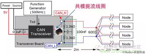 CAN要求通信质量有很高的可靠性,特别是对可靠性产生影响的电磁噪声。为了电磁噪声问题不对汽车内部使用的无线通信等产生影响,除必须抑制噪声的发生外,对于从周围混入的噪声,为保证通信质量,也要求要保持高度的耐性。例如,放射噪声中,信号频率250kHz(或500kHz)的高频噪声在高水平下能够被放射到数十MHz带域。