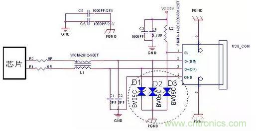 D1、D2、D3选用TVS,TVS反向关断电压为5V。TVS管的结电容对信号传输频率有一定的影响,usb2.0的TVS结电容小于5pF;