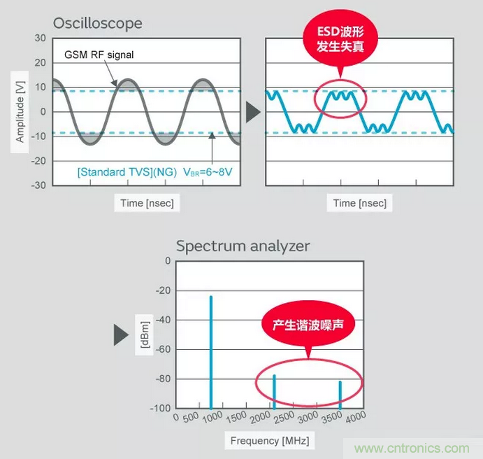 一般使用TVS的场合,即使信号振幅超过TVS的击穿电压(VBR)的一瞬间,信号波形也会失真。因此,信号频率外谐波噪声发生,受其他信号干扰,都会导致天线的接收灵敏度降低。
