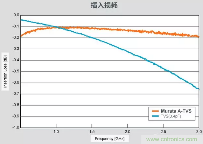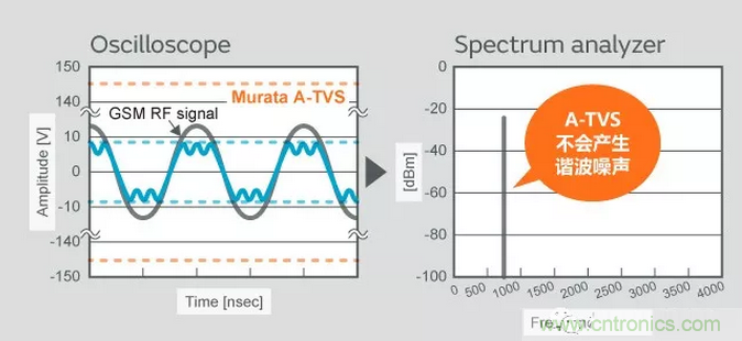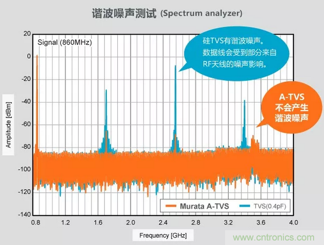 因此,不会产生谐波噪声的村田的A-TVS(LXES**A系列)可以说更加适用于RF天线的ESD保护方案。